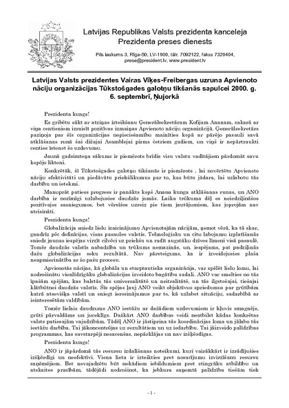 Latvijas Valsts prezidentes Vairas Vīķes-Freibergas uzruna Apvienoto nāciju organizācijas Tūkstošgades galotņu tikšanās sapulcei 2000. g. 6. septembrī, Ņujorkā