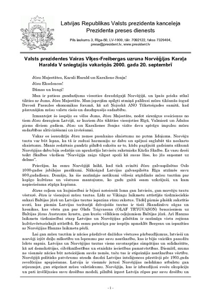 Valsts prezidentes Vairas Vīķes-Freibergas uzruna Norvēģijas Karaļa Haralda V sniegtajās vakariņās 2000. gada 20. septembrī