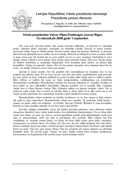 Valsts prezidentes Vairas Vīķes-Freibergas uzruna Rīgas 13.vidusskolā 2000.gada 1.septembrī.