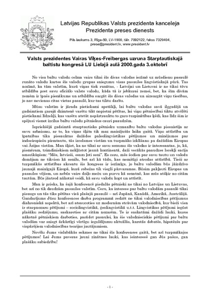 Valsts prezidentes Vairas Vīķes-Freibergas uzruna Starptautiskajā baltistu kongresā LU Lielajā aulā 2000.gada 3.oktobrī