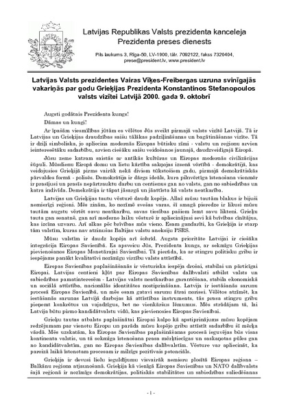 Latvijas Valsts prezidentes Vairas Vīķes-Freibergas uzruna svinīgajās vakariņās par godu Grieķijas Prezidenta Konstantinos Stefanopoulos valsts vizītei Latvijā 2000. gada 9. oktobrī