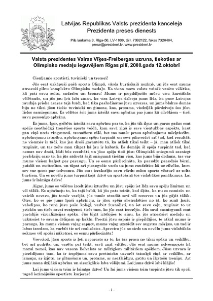Valsts prezidentes Vairas Vīķes-Freibergas uzruna, tiekoties ar Olimpisko medaļu ieguvējiem Rīgas pilī, 2000.gada 12.oktobrī