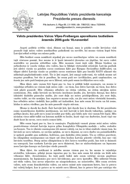 Valsts prezidentes Vairas Vīķes-Freibergas apsveikums tautiešiem ārzemēs 2000.gada 18.novembrī