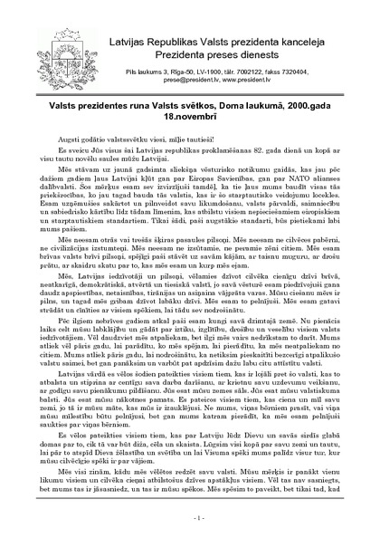 Valsts prezidentes runa Valsts svētkos, Doma laukumā, 2000.gada 18.novembrī