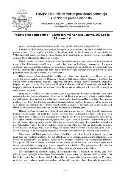 Valsts prezidentes runa 1.Bērnu forumā Kongresu namā, 2000.gada 24.novembrī