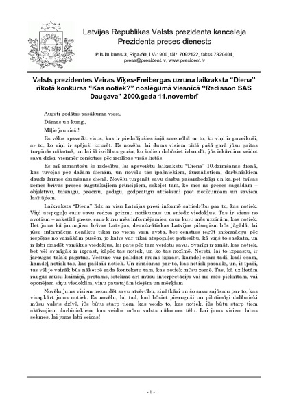 Valsts prezidentes Vairas Vīķes-Freibergas uzruna laikraksta “Diena” rīkotā konkursa “Kas notiek?” noslēgumā viesnīcā “Radisson SAS Daugava” 2000.gada 11.novembrī