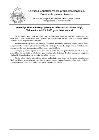 Ģenerāļa Pētera Radziņa piemiņas plāksnes atklāšanai Rīgā, Valdemāra ielā 23, 2000.gada 14.novembrī