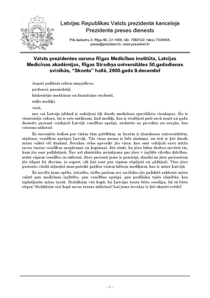 Valsts prezidentes uzruna Rīgas Medicības institūta, Latvijas Medicīnas akadēmijas, Rīgas Stradiņa universitātes 50.gadadienas svinībās, “Skonto” hallē, 2000.gada 9.decembrī