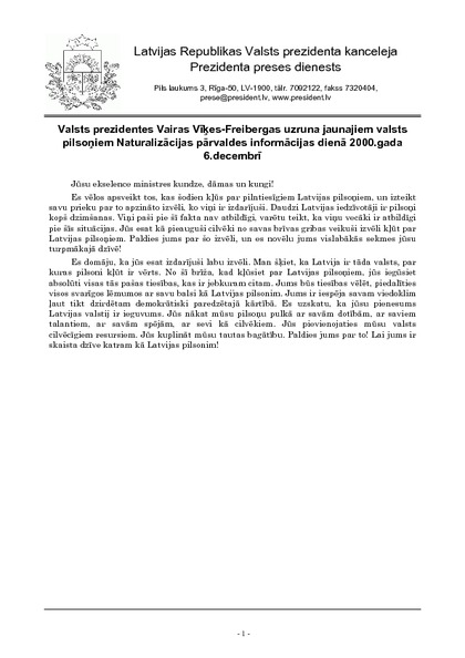 Valsts prezidentes Vairas Vīķes-Freibergas uzruna jaunajiem valsts pilsoņiem Naturalizācijas pārvaldes informācijas dienā 2000.gada 6.decembrī