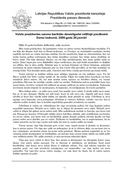 Valsts prezidentes uzruna barikāžu desmitgadei veltītajā pasākumā Doma laukumā, 2000.gada 20.janvārī