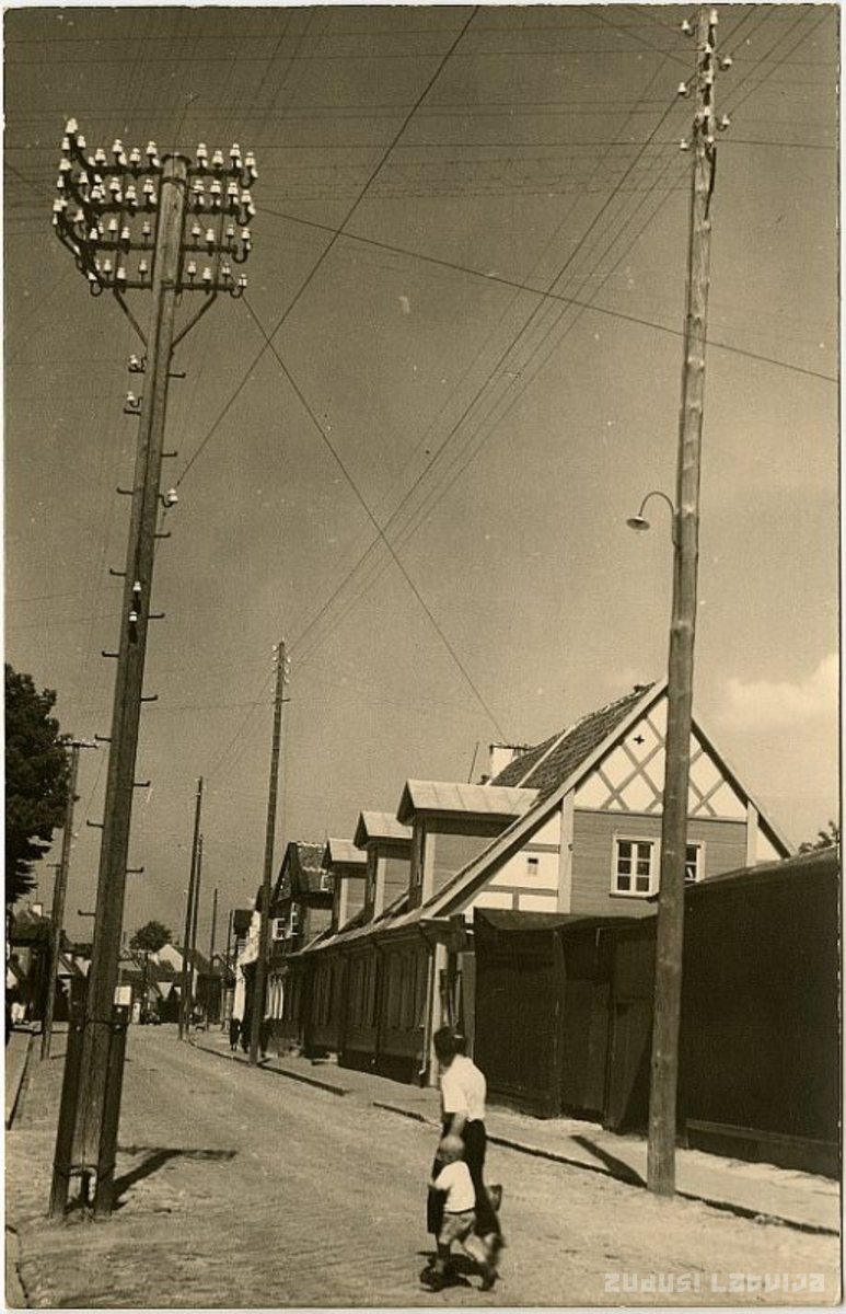 Jelgava. Iela ar elektrības stabiem un nelielām ēkām