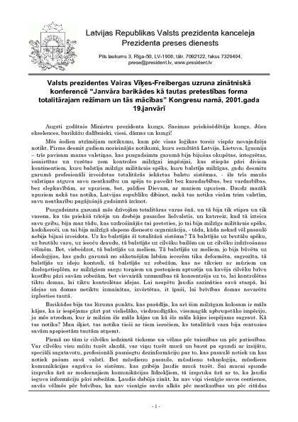 Valsts prezidentes Vairas Vīķes-Freibergas uzruna zinātniskā konferencē “Janvāra barikādes kā tautas pretestības forma totalitārajam režīmam un tās mācības” Kongresu namā, 2001.gada 19.janvārī