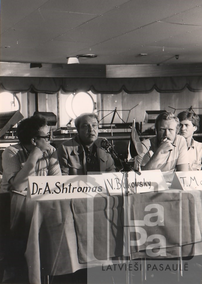 Diskusiju panelis par mieru un cilvēku tiesībām akcijas "Baltijas Brīvības un miera kuģis" laikā. Piedalās (no kreisās): lietuviešu disidents, politikas zinātnieks Aleksandrs Štromas (Alexandras Štromas), padomju disidents un cilvēktiesību aizstāvis Vladimirs Bukovskis (Vladimir Bukovsky; Влади́мир Константи́нович Буко́вский), zviedrs Tomas Magnusons (Tomass Magnusson).