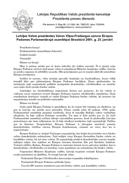 Latvijas Valsts prezidentes Vairas Vīķes-Freibergas uzruna Eiropas Padomes Parlamentārajai asamblejai Strasbūrā 2001. g. 23. janvārī