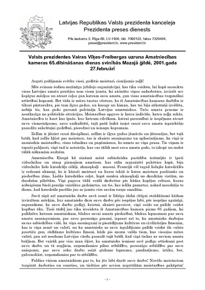 Valsts prezidentes Vairas Vīķes-Freibergas uzruna Amatniecības kameras 65.dibināšanas dienas svinībās Mazajā ģildē, 2001.gada 27.februārī