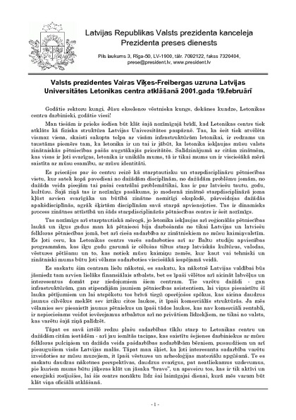 Valsts prezidentes Vairas Vīķes-Freibergas uzruna Latvijas Universitātes Letonikas centra atklāšanā 2001.gada 19.februārī