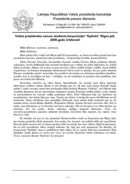 Valsts prezidentes uzruna studentu korporācijai “Spīdola” Rīgas pilī, 2000.gada 2.februārī