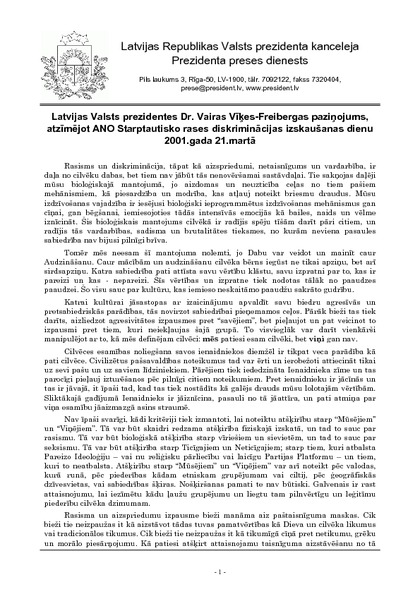 Latvijas Valsts prezidentes Dr. Vairas Vīķes-Freibergas paziņojums, atzīmējot ANO Starptautisko rases diskriminācijas izskaušanas dienu 2001.gada 21.martā