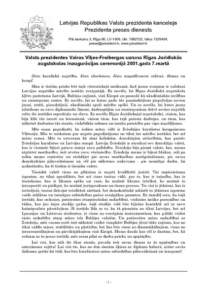 Valsts prezidentes Vairas Vīķes-Freibergas uzruna Rīgas Juridiskās augstskolas inaugurācijas ceremonijā 2001.gada 7.martā