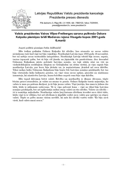 Valsts prezidentes Vairas Vīķes-Freibergas uzruna pulkveža Oskara Kalpaka piemiņas brīdī Madonas rajona Visagala kapos 2001.gada 6.martā