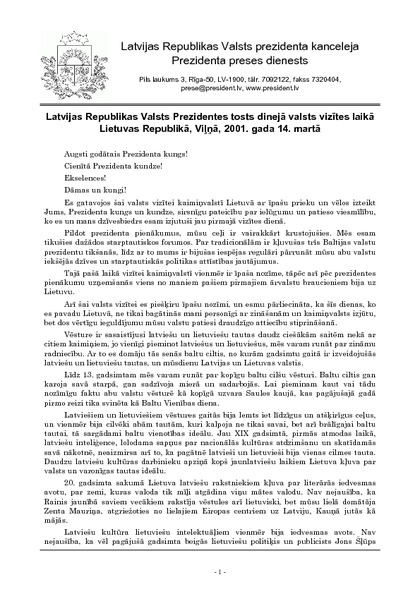 Latvijas Republikas Valsts Prezidentes tosts dinejā valsts vizītes laikā Lietuvas Republikā, Viļņā, 2001. gada 14. martā