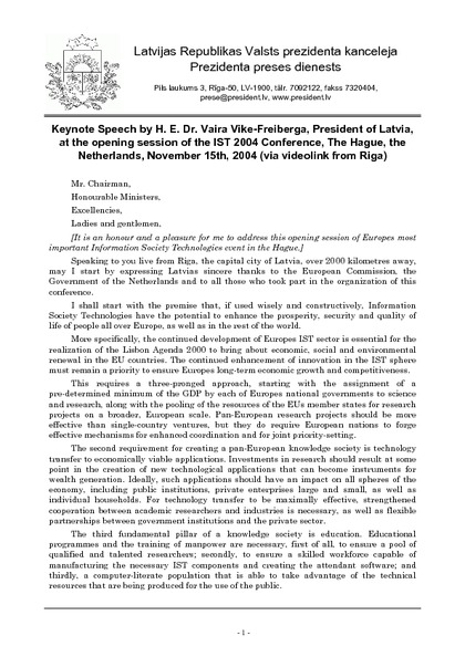 Keynote Speech by H. E. Dr. Vaira Vike-Freiberga, President of Latvia, at the opening session of the IST 2004 Conference, The Hague, the Netherlands, November 15th, 2004 (via videolink from Riga)
