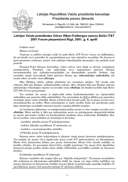 Latvijas Valsts prezidentes Vairas Vīķes-Freibergas uzruna Baltic IT&T 2001 Forum pieņemšanā Rīgā, 2001. g. 4. aprīlī