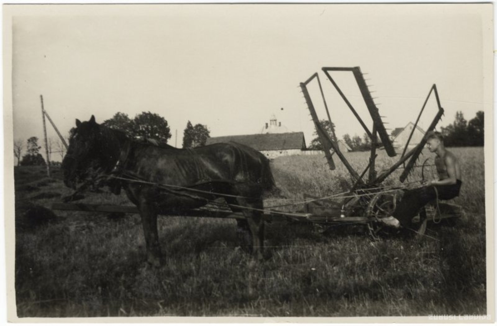 Rembates pagasts. Zirgu velkamais siena pļāvējs pie "Garziedu" mājām