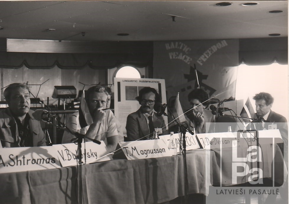 Diskusiju panelis par mieru un cilvēku tiesībām akcijas "Baltijas Brīvības un miera kuģis" laikā. Piedalās (no kreisās): padomju disidents un cilvēktiesību aizstāvis Vladimirs Bukovskis (Vladimir Bukovsky; Влади́мир Константи́нович Буко́вский), zviedrs Tomas Magnusons (Tomass Magnusson), "Solidarnostj" aktīvists Andrzejs Zvanecki (Andrzej Zwaniecki), ASV politikas zinātnieks Džeims Der Derians (James DerDerian), latviešu nacionālās pretošanās kustības dalībnieks, bijušais politieslodzītais, disidents Gunārs Rode.