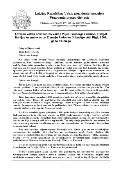Latvijas Valsts prezidentes Vairas Vīķes-Freibergas uzruna, atklājot Baltijas Asamblejas un Ziemeļu Padomes 3. kopīgo sēdi Rīgā, 2001. gada 31. maijā