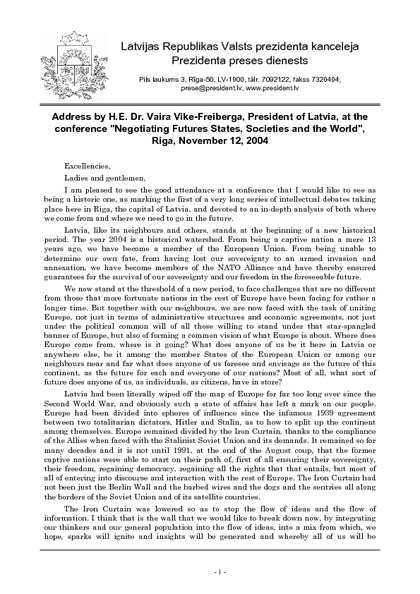 Address by H.E. Dr. Vaira Vike-Freiberga, President of Latvia, at the conference "Negotiating Futures States, Societies and the World'', Riga, November 12, 2004
