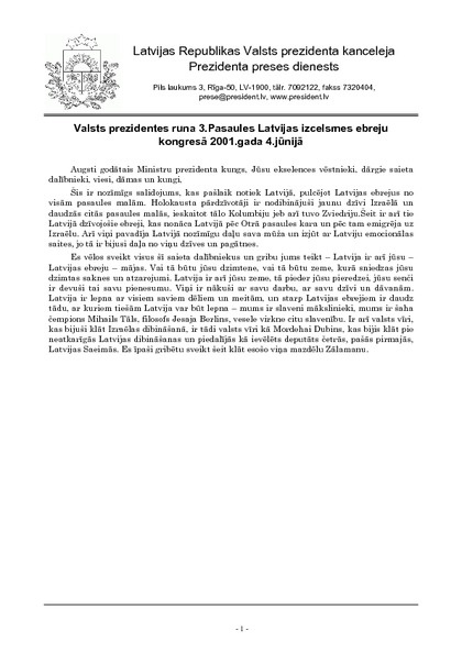 Valsts prezidentes runa 3.Pasaules Latvijas izcelsmes ebreju kongresā 2001.gada 4.jūnijā