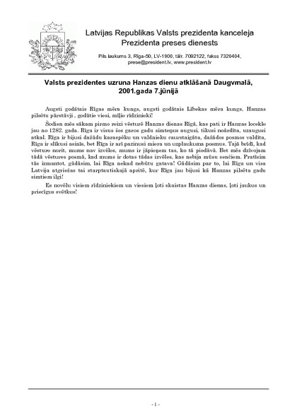 Valsts prezidentes uzruna Hanzas dienu atklāšanā Daugvmalā, 2001.gada 7.jūnijā