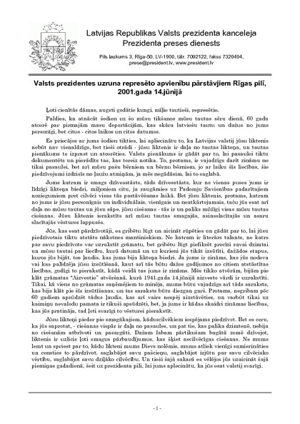 Valsts prezidentes uzruna represēto apvienību pārstāvjiem Rīgas pilī, 2001.gada 14.jūnijā