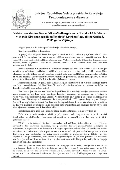 Valsts prezidentes Vairas Vīķes-Freibergas runa “Latvija kā brīvās un vienotās Eiropas topošā dalībvalsts” Latvijas Republikas Saeimā, 2001.gada 21.jūnijā