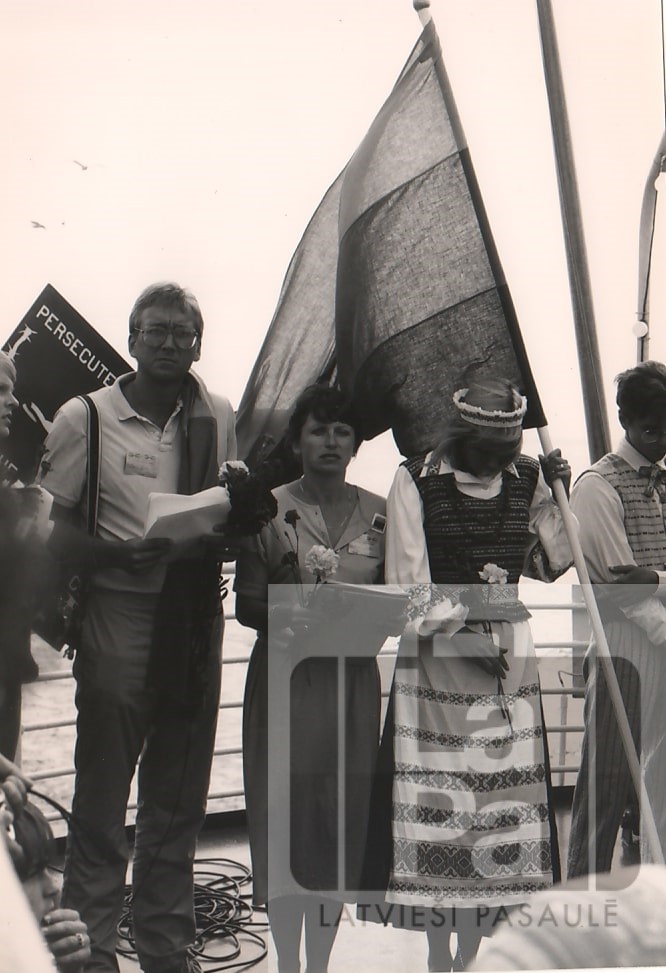 Lietuvieši gatavojas mest ziedus jūrā Baltijas Brīvības un miera kuģa brauciena laikā.