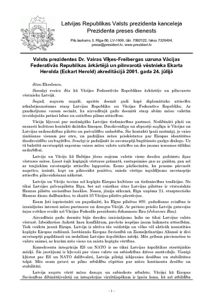 Valsts prezidentes Dr. Vairas Vīķes-Freibergas uzruna Vācijas Federatīvās Republikas ārkārtējā un pilnvarotā vēstnieka Ekarta Herolda (Eckart Herold) akreditācijā 2001. gada 24. jūlijā