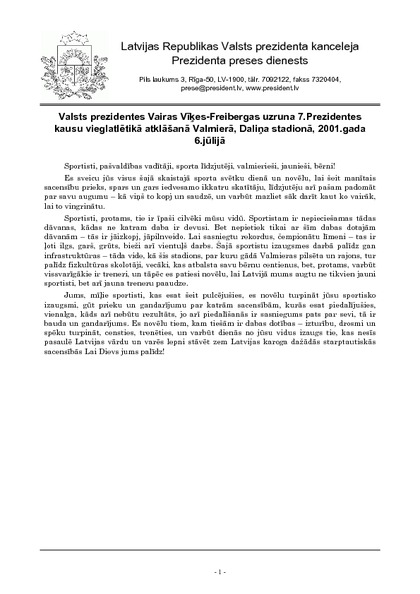 Valsts prezidentes Vairas Vīķes-Freibergas uzruna 7.Prezidentes kausu vieglatlētikā atklāšanā Valmierā, Daliņa stadionā, 2001.gada 6.jūlijā