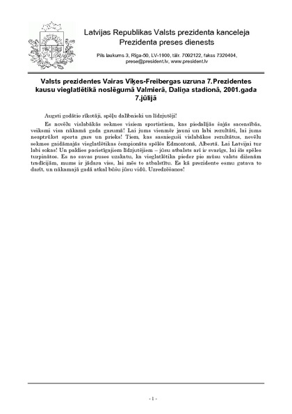 Valsts prezidentes Vairas Vīķes-Freibergas uzruna 7.Prezidentes kausu vieglatlētikā noslēgumā Valmierā, Daliņa stadionā, 2001.gada 7.jūlijā