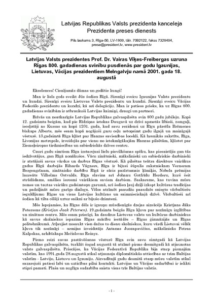 Latvijas Valsts prezidentes Prof. Dr. Vairas Vīķes-Freibergas uzruna Rīgas 800. gadadienas svinību pusdienās par godu Igaunijas, Lietuvas, Vācijas prezidentiem Melngalvju namā 2001. gada 18. augustā