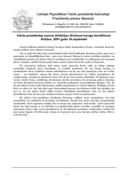 Valsts prezidentes uzruna Artilērijas diviziona karoga iesvētīšanā, Ādažos, 2001.gada 14.septembrī