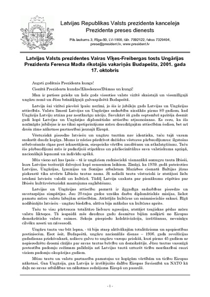 Latvijas Valsts prezidentes Vairas Vīķes-Freibergas tosts Ungārijas Prezidenta Ferenca Madla rīkotajās vakariņās Budapešta, 2001. gada 17. oktobris