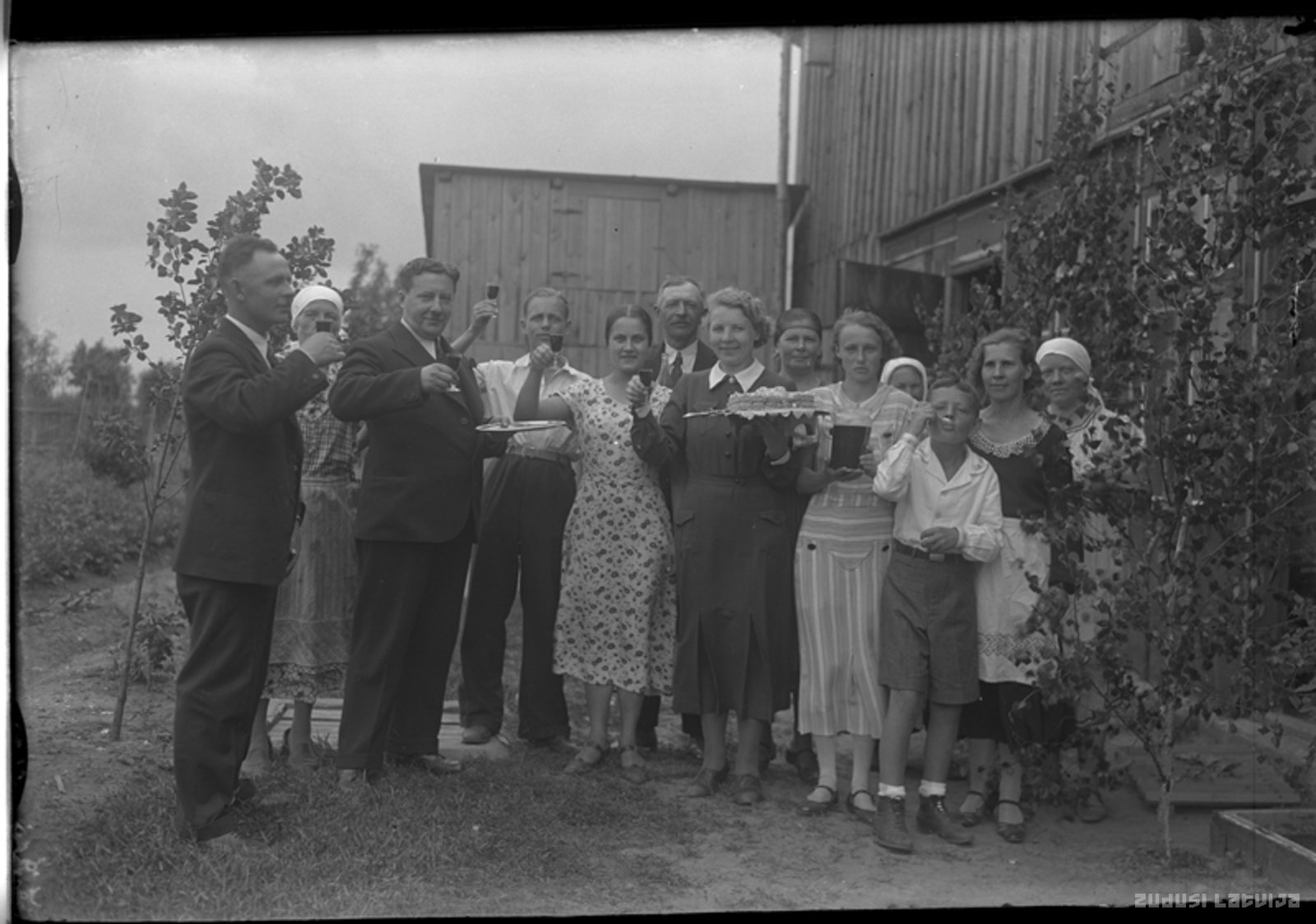 Cilvēku grupa svētku tērpos mājas pagalmā. Sieviete tur kūku