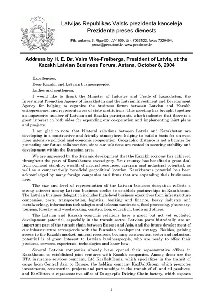 Address by H. E. Dr. Vaira Vike-Freiberga, President of Latvia, at the Kazakh Latvian Business Forum, Astana, October 8, 2004