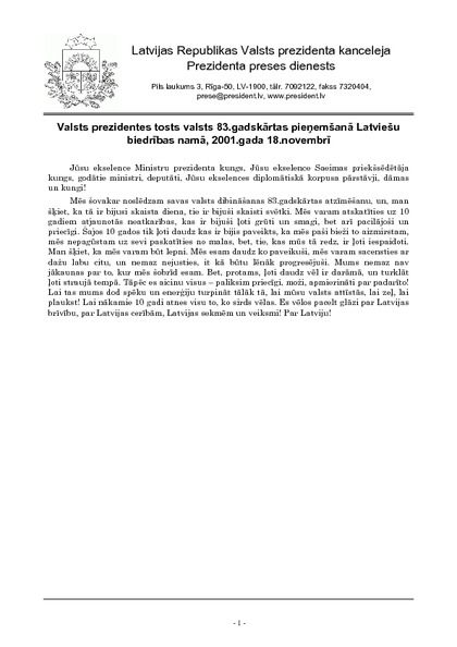 Valsts prezidentes tosts valsts 83.gadskārtas pieņemšanā Latviešu biedrības namā, 2001.gada 18.novembrī