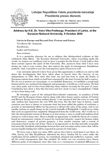 Address by H.E. Dr. Vaira Vike-Freiberga, President of Latvia, at the Eurasian National University, 9 October 2004