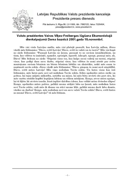 Valsts prezidentes Vairas Vīķes-Freibergas lūgšana Ekumeniskajā dievkalpojumā Doma baznīcā 2001.gada 18.novembrī.