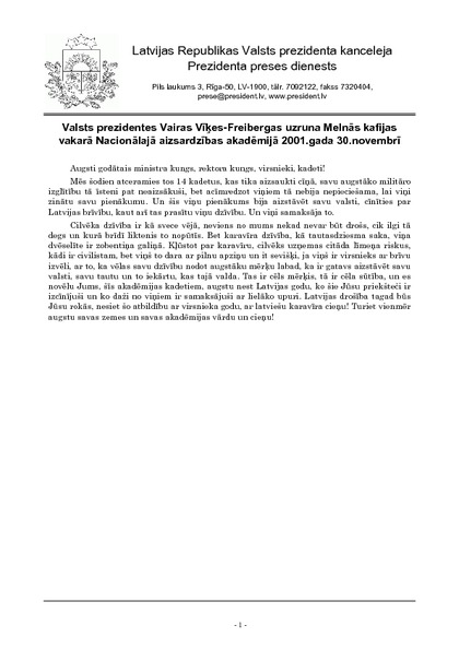Valsts prezidentes Vairas Vīķes-Freibergas uzruna Melnās kafijas vakarā Nacionālajā aizsardzības akadēmijā 2001.gada 30.novembrī