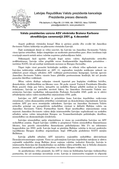Valsts prezidentes uzruna ASV vēstnieka Braiena Karlsona akreditācijas ceremonijā 2001.g. 4.decembrī