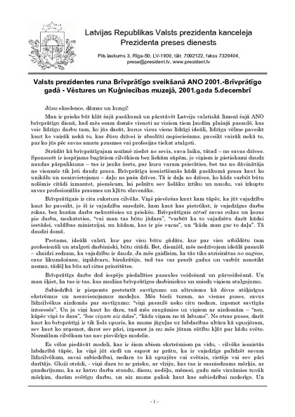 Valsts prezidentes runa Brīvprātīgo sveikšanā ANO 2001.-Brīvprātīgo gadā - Vēstures un Kuģniecības muzejā, 2001.gada 5.decembrī